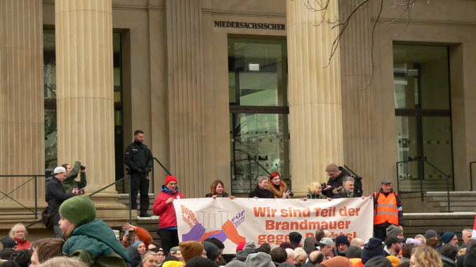 die Anwesenden dazu auf die so bezeichnete „Brandmauer“ einzureißen.